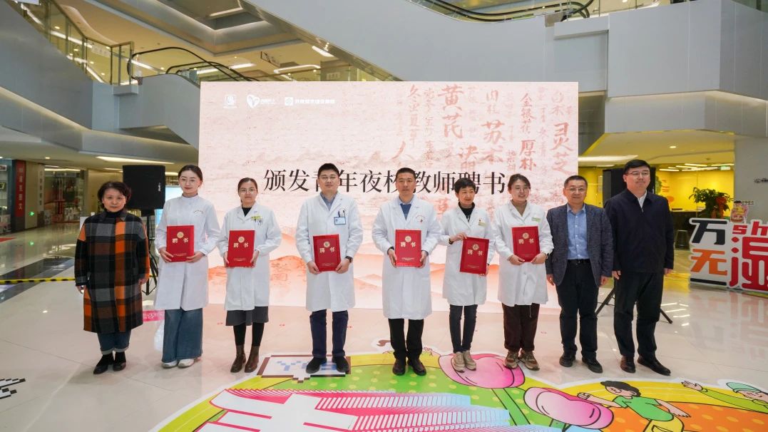 活動中,與會領導啟動了“青年夜校青年名中醫系列課程”,并為青年名中醫教師代表頒發了聘書,隨后參觀了集團青年夜校教學場地及中醫市集。